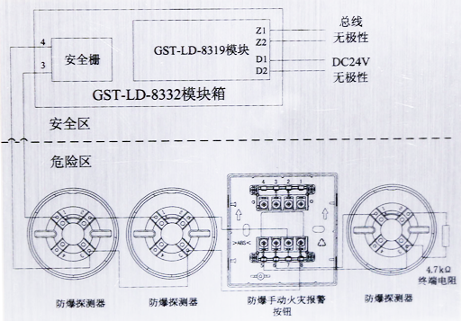 GST-LD-8332編址接口模塊(以下簡(jiǎn)稱(chēng)編址接口模塊)可與防爆設(shè)備(防爆感溫、感煙、煙溫復(fù)合探測(cè)器、防爆手動(dòng)報(bào)警按鈕等)配接,組成本安型防爆系統(tǒng)。一旦發(fā)生火災(zāi),編址接口模塊將報(bào)警信號(hào)通過(guò)總線(xiàn)傳入火災(zāi)報(bào)警控制器(以下簡(jiǎn)稱(chēng)控制器),控制器產(chǎn)生報(bào)警信號(hào)并顯示出編址接口模塊的報(bào)警地址信息。當(dāng)編址接口模塊本身出現(xiàn)故障時(shí),控制器將產(chǎn)生故障信號(hào)并顯示編址接口模塊故障地址信息。