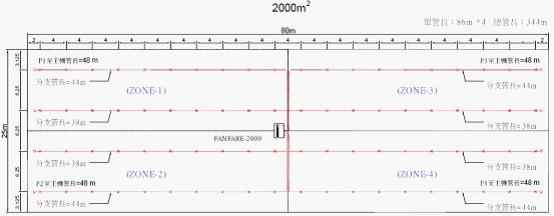 下圖是防火分區(qū)2000m2,使用FANFARE-2000探測(cè)主機(jī),分為4個(gè)探測(cè)區(qū)域(每區(qū)500m2),采樣孔保護(hù)面積25.2m2的管路設(shè)計(jì)圖